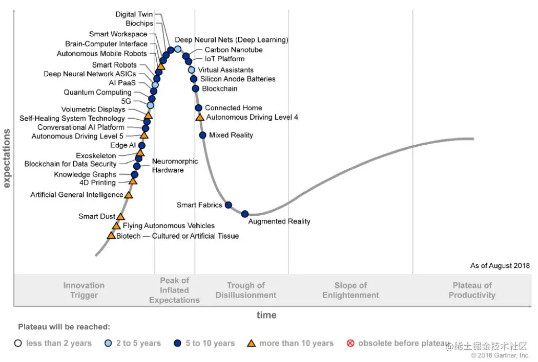 Gartner2018技术成熟度曲线,Gartner每年发布的技术趋势曲线,聚焦未来5到10年间,可能产生巨大竞争力的新兴技术