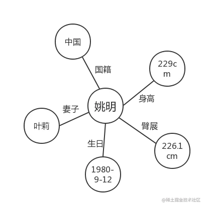 图谱的英文是graph,直译过来就是“图”的意思。在图论(数学的一个研究分支)中,图(graph)表示一些事物(objects)与另一些事物之间相互连接的结构。一张图通常由一些结点(vertices或nodes)和连接这些结点的边(edge)组成。Sylvester在1878年首次提出了“图”这一名词[7]。如果我们把姚明相关的“知识”用“图谱”构建起来
