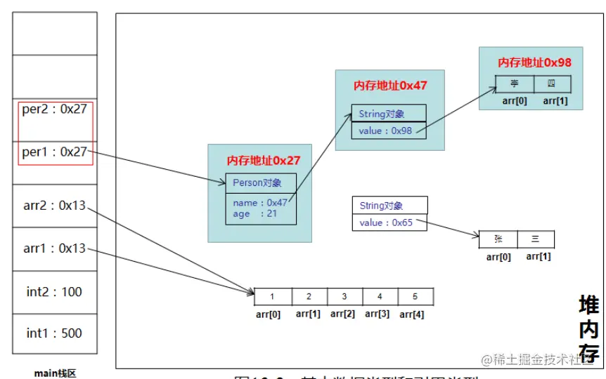 在引用类型中,"=="是比较两个引用是否指向堆内存里的同一个地址(同一个对象),
