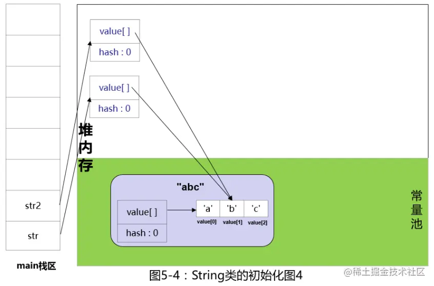 在Java中,当值被双引号引起来(如本示例中的"abc"),JVM会去先检查看一看常量池里有没有abc这个对象,