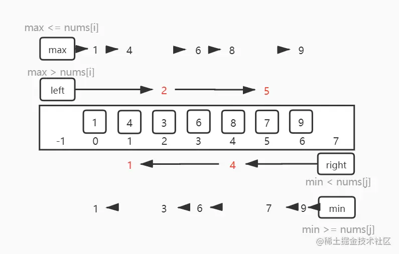 不管是那种情况,我们都只需要对一个子数组进行排序即可,其余不在子数组范围内的元素均已排好序,可以不用关注,那这里我们可以通过双指针来确定出子数组的左右边界,即可得到结果: