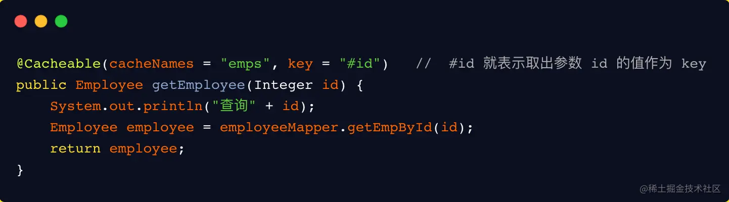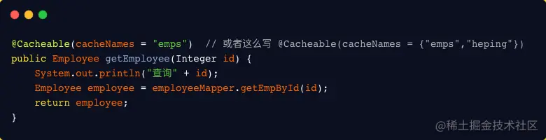 注:这里使用 @Cacheable 注解就可以将运行结果缓存,以后查询相同的数据,直接从缓存中取,不需要调用方法。