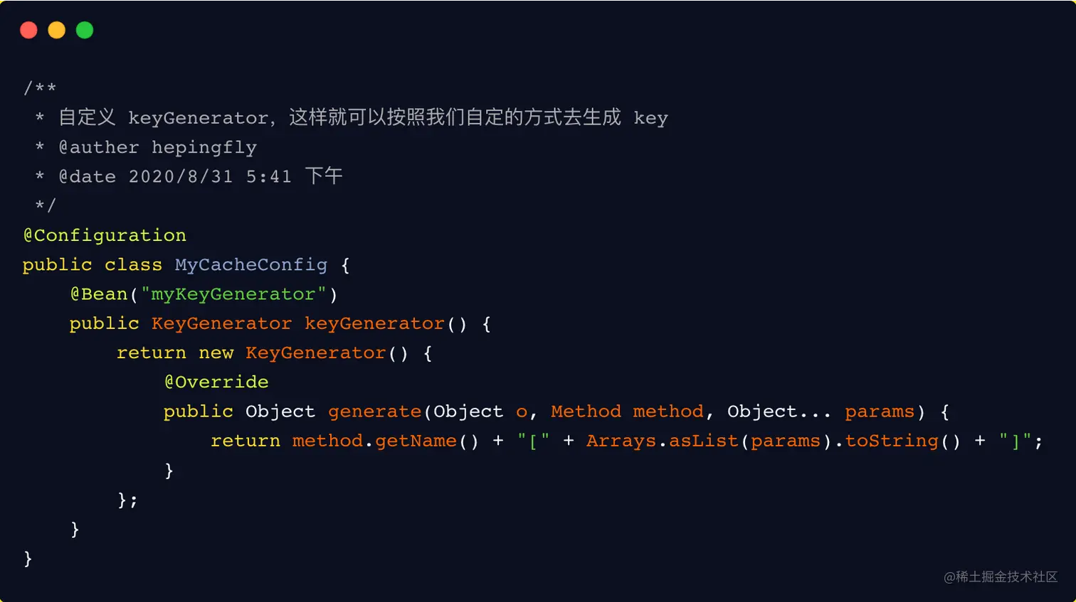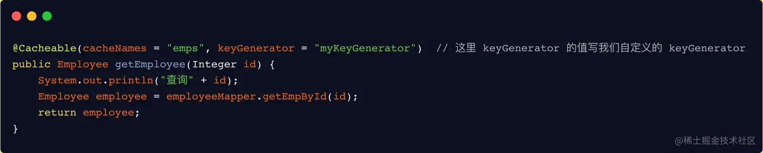 这样放入缓存中的 key 的生成规则就按照你自定义的 keyGenerator 来生成。不过需要注意的是: