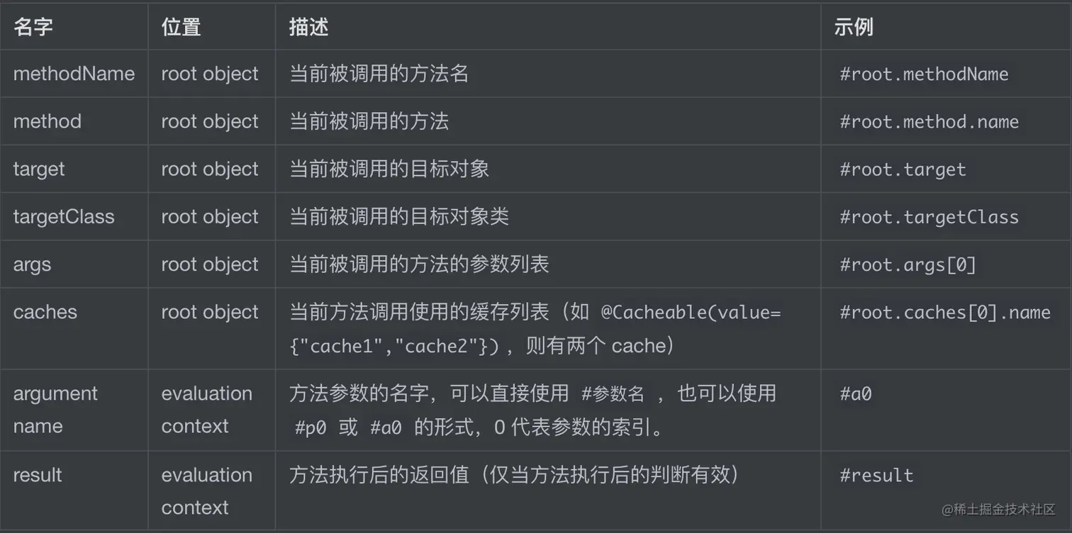 前面说过,缓存的 key 支持使用 spEL 表达式去编写,下面总结一下使用 spEL 去编写 key 可以用的一些元数据: