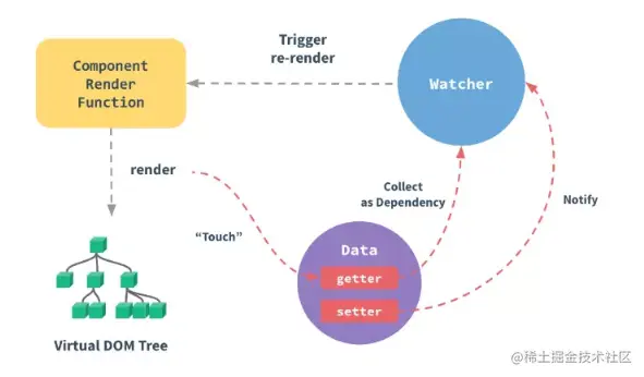 - 当Vue Component render函数被执行的时候,data上会被触碰(touch),即被读,getter方法会被调用,此时Vue会去记录此Vue component所依赖的所有data。(这一过程被称为依赖收集)