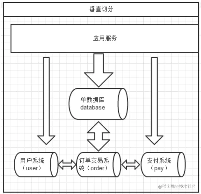 一个数据库由很多表的构成,每个表对应着不同的业务,垂直切分是指按照业务将表进行分类,分布到不同的数据库上面,这样也就将数据或者说压力分担到不同的库上面,如下图: