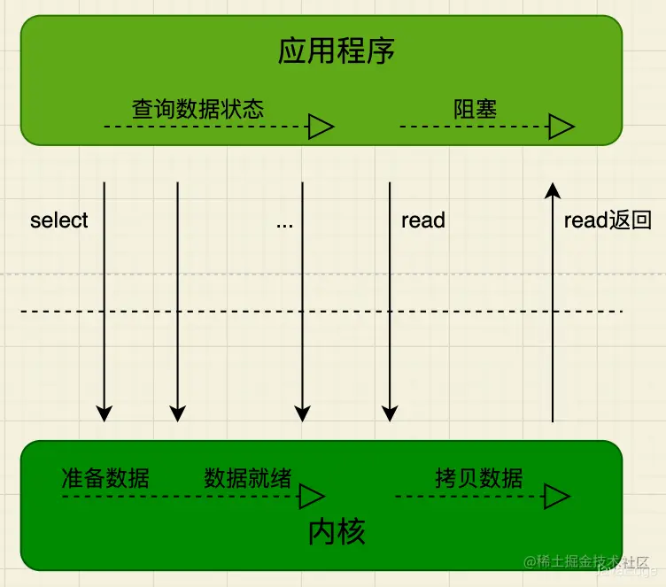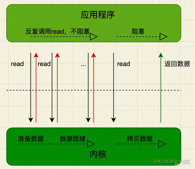 用户线程不断发起read调用,数据没到内核空间时,每次都返回失败,直到数据到了内核空间,这次read调用后,在等待数据从内核空间拷贝到用户空间这段时间里,线程还是阻塞的,等数据到了用户空间再把线程叫醒。