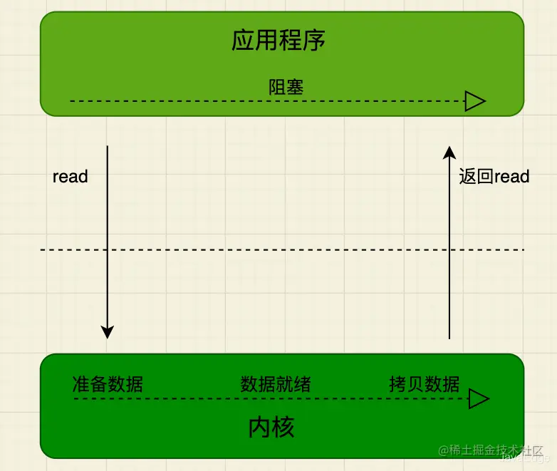 用户线程发起read调用后就阻塞了,让出CPU。内核等待网卡数据到来,把数据从网卡拷贝到内核空间,接着把数据拷贝到用户空间,再把用户线程叫醒。
