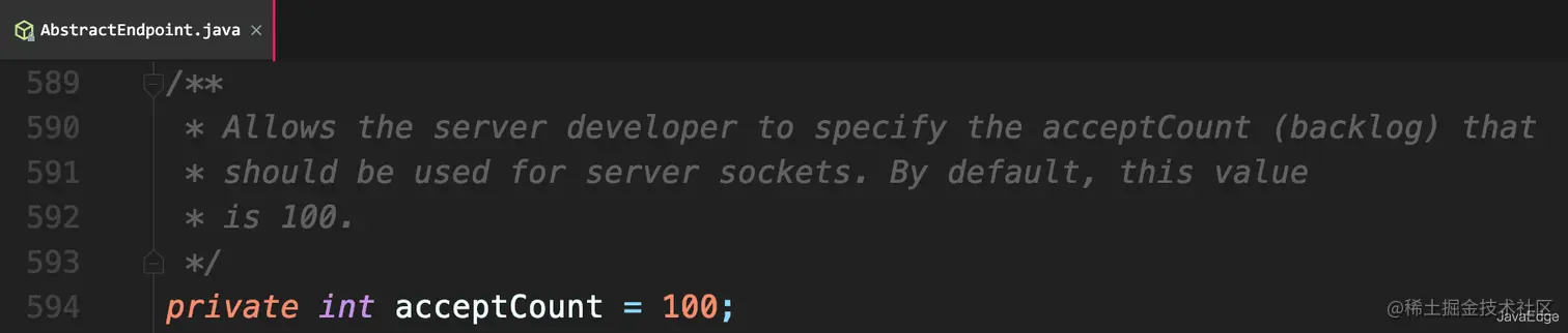 - bind方法的 getAcceptCount() 参数表示os的等待队列长度。当应用层的连接数到达最大值时,os可以继续接收连接,os能继续接收的最大连接数就是这个队列长度,可以通过acceptCount参数配置,默认是100