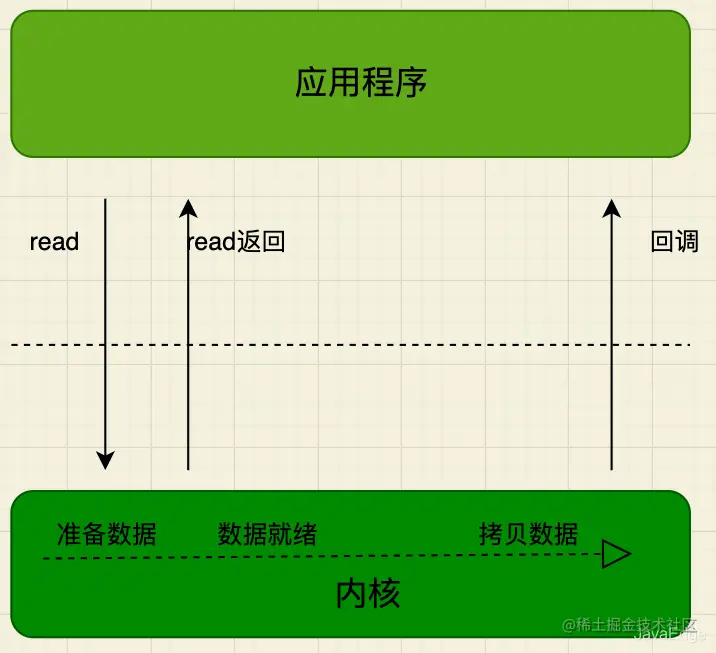 用户线程发起read调用的同时注册一个回调函数,read立即返回,等内核将数据准备好后,再调用指定的回调函数完成处理。在这个过程中,用户线程一直没有阻塞。