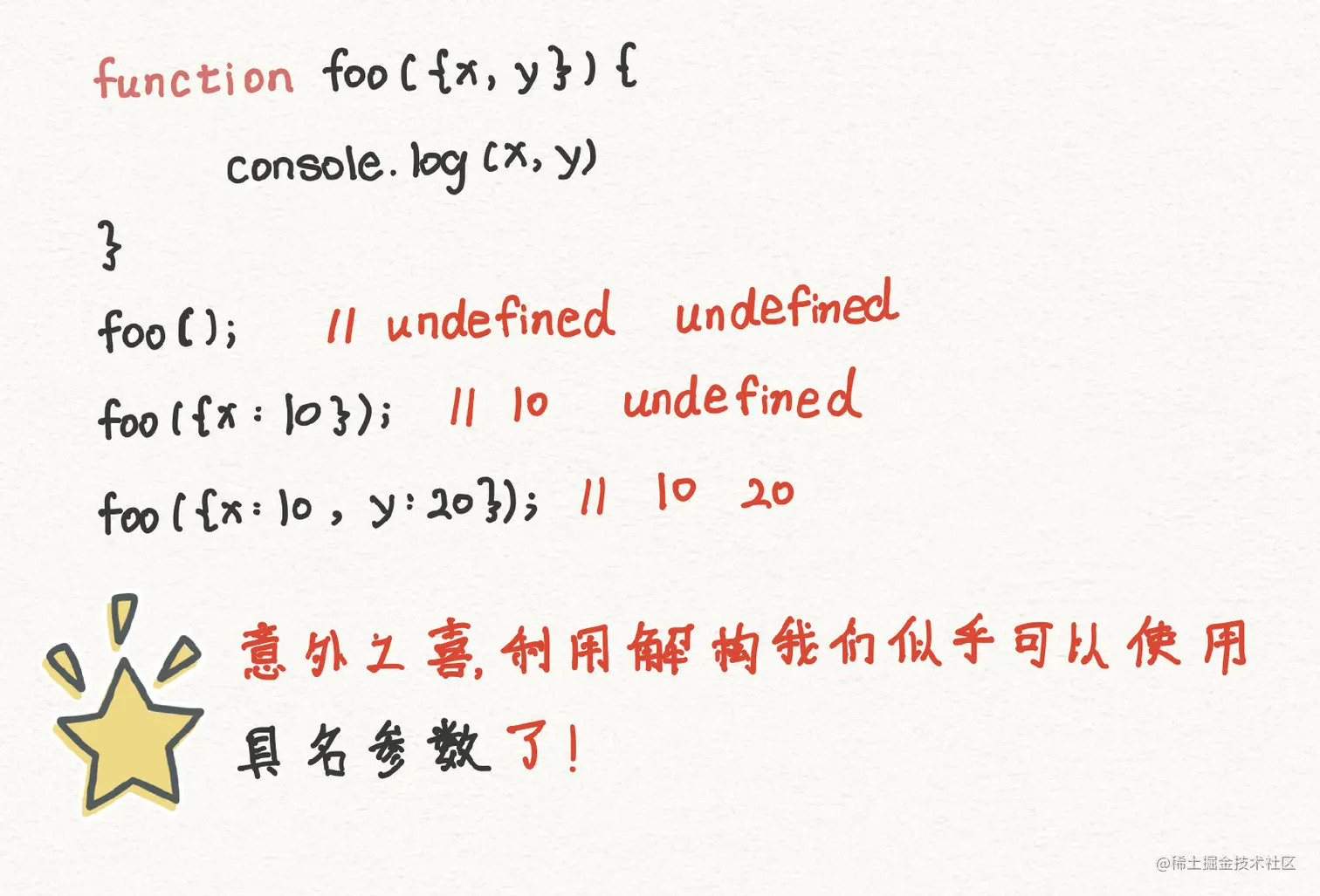 利用对象解构,我们甚至可以使用具名参数了(这个也太棒了!!)同时这也意味着我们得到了可选参数的功能,不想传递的参数直接就pass!!