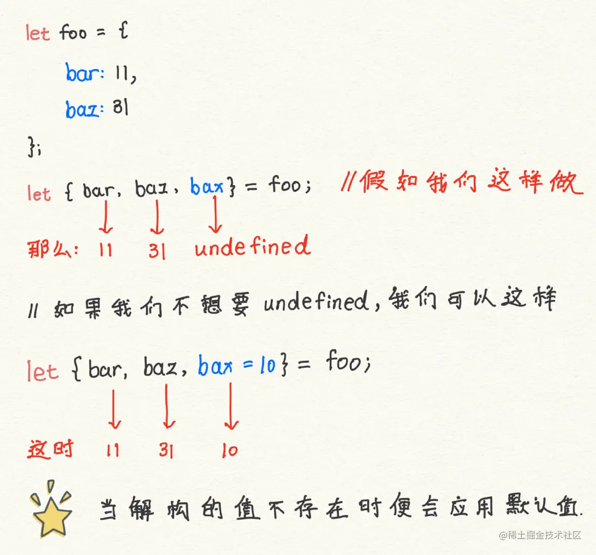 就像函数的参数可以有默认值外,我们解构时也可以使用默认值,当解构的值不存在时,便会应用我们的默认值。