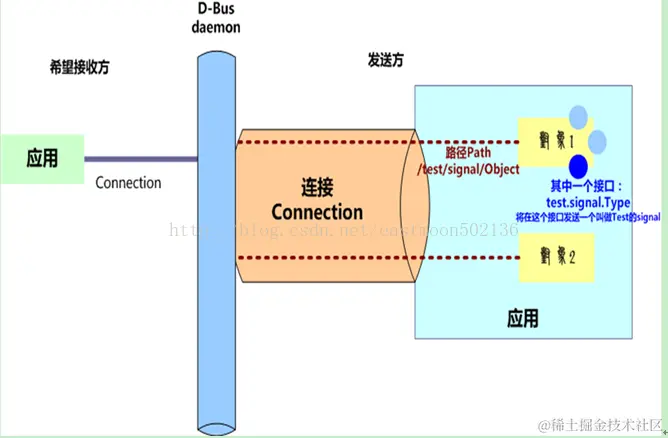 监听method和监听signal的方式非常相似。在给出例子之前,我希望和上次学习一样给出一个示意图,更好地了解D-Bus的各个概念。