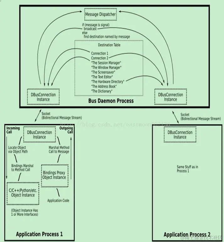 Bus daemon是一个特殊的进程:这个进程可以从一个进程传递消息给另外一个进程。当然了,如果有很多applications链接到这个通道上,这个 daemon进程就会把消息转发给这些链接的所有程序。在最底层,D-Bus只支持点对点的通信,一般使用本地套接字(AF_UNIX)在应用和bus daemon之间通信。D-Bus的点对点是经过busdaemon抽象过的,由busdaemon来完成寻址和发送消息,因此每个应用不必要关心要把消息发给哪个进程。D-Bus发送消息通常包含如下步骤(正常情况下):