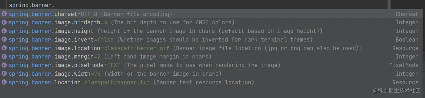 在SpringBoot的配置文件(application.yml/application.properties)中可以配置Banner相关的信息,可见当我们不想把Banner文件的名字叫做banner.txt是,可以通过spring.banner.location=classpath:xxx.txt来指定,但是既然都约定好了,我们就按照这个约定来配置就好。还可以看到其实还可以使用图片Banner。