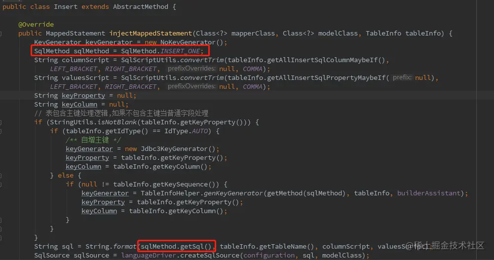 利用模板模式,子类只需要重写injectMappedStatement()方法,上面初始化的部分都可以共用。AbstractMethod的子类有很多,我们选个有代表性的看一下,就可以推断其他的用途,比如Insert类。