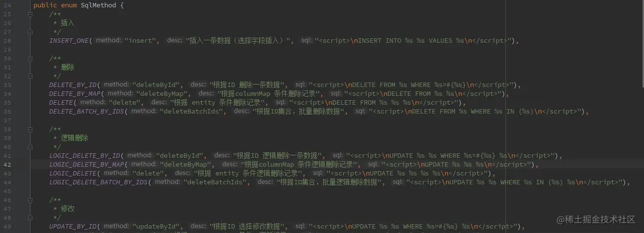 由此可看出,BaseMapper里的语句信息模板,来自于枚举SqlMethod。