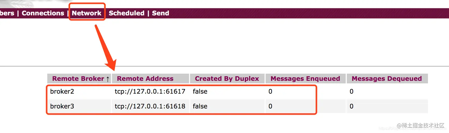 直接打开MQ的WEB控制台,默认地址 http://10.10.1.44:8161/ 到network的菜单项可以看到如下效果