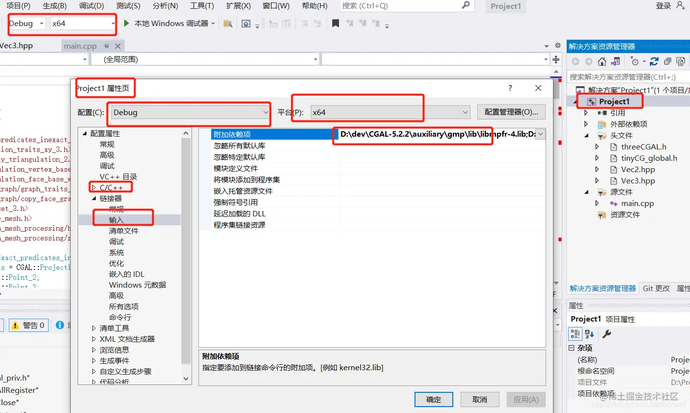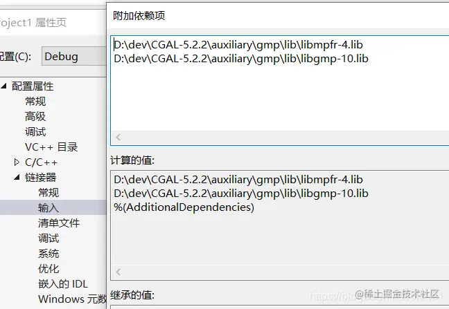 链接器->输入->附加依赖项:(因为项目需要,我换了新的CGAL版本)