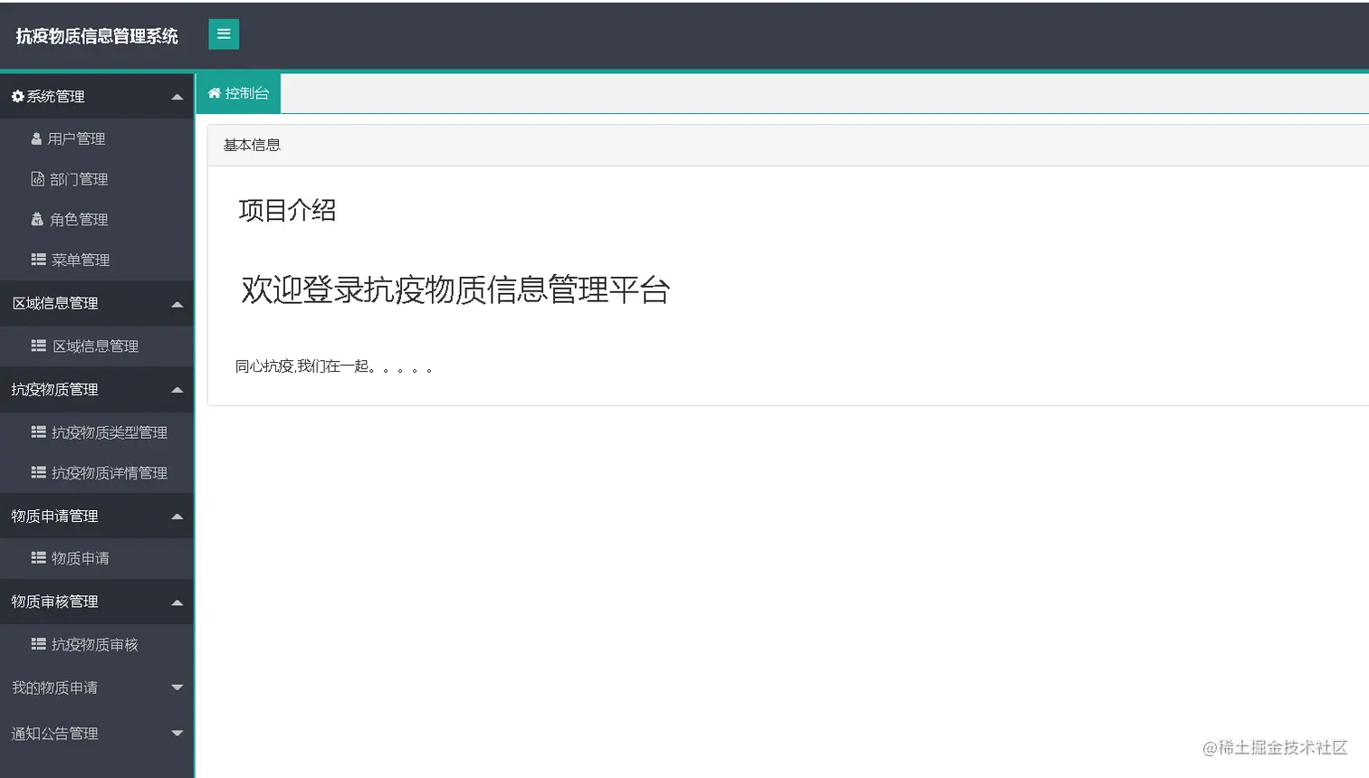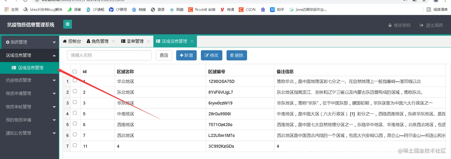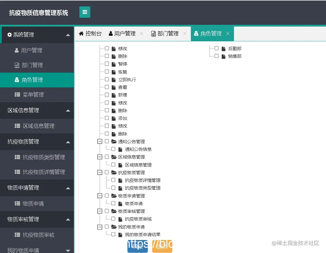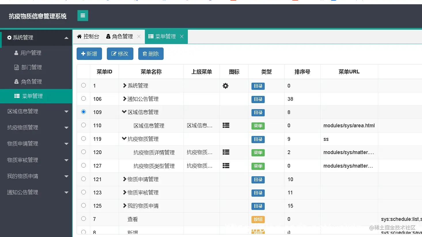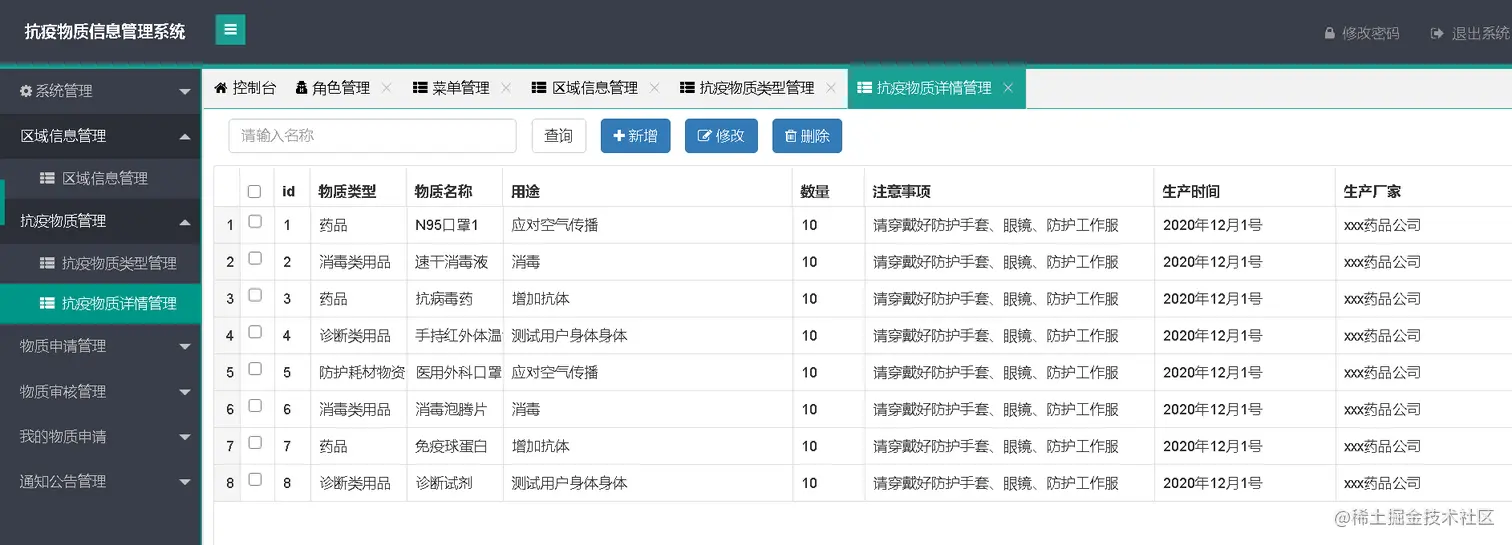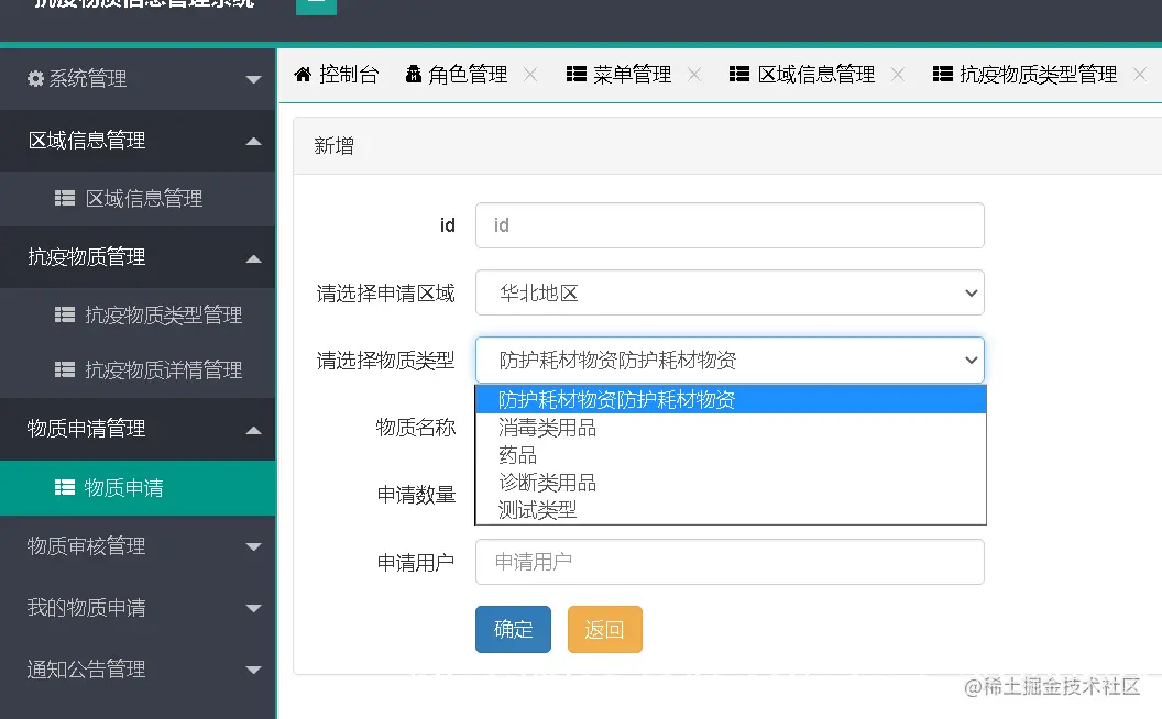 用户、区域、物质类型、物质详情、物质申请和审核以及我的申请和通知公告以及灵活控制菜单权限