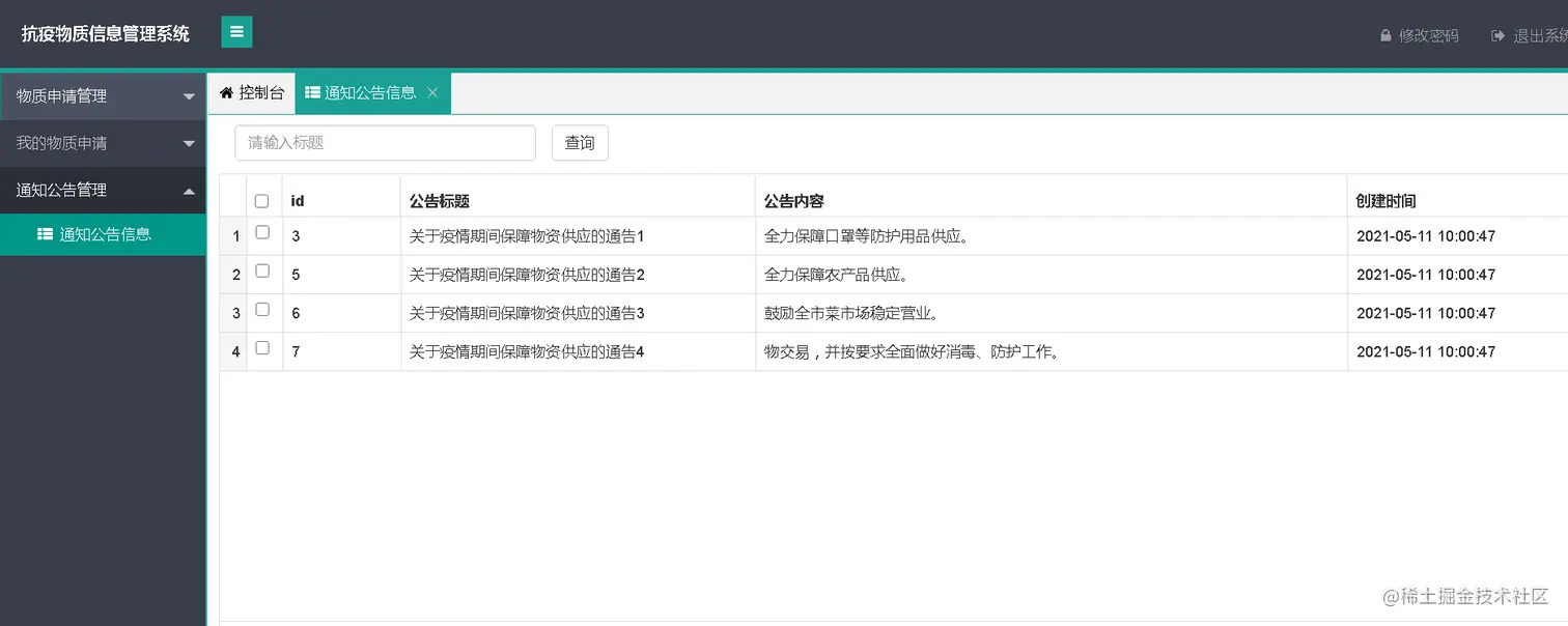 业务模块功能:区域管理、对不同区域的进行管理以及物质发放等、物质类型管理、物质详情管理、物质申请管理、物质审核管理、我的物质申请管理、以及系统通知公告查看等具体功能模块、以及修改密码退出等。