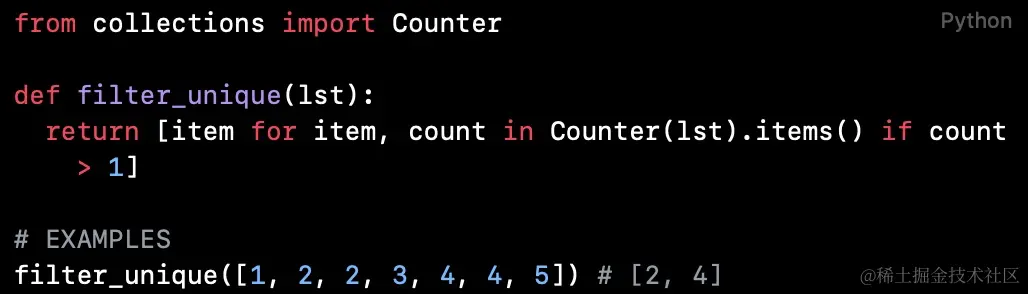 函数使用collections.Counter函数对列表进行计数,在通过列表推导式,将非唯一值过滤出去(过滤掉计数大于1的值)。