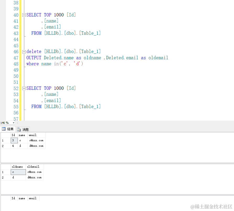 OUTPUT Deleted.name as oldname ,Deleted.email as oldemail