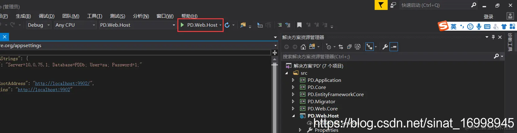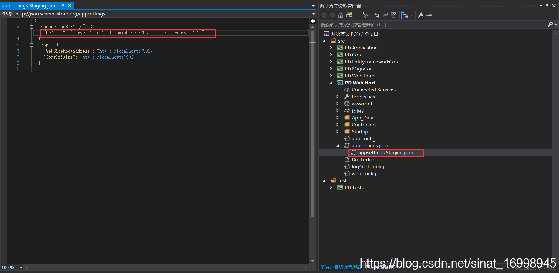 (1) 打开配置文件 PD.Web.Host\appsettings.Staging.json 修改数据库配置(仅修改密码即可)