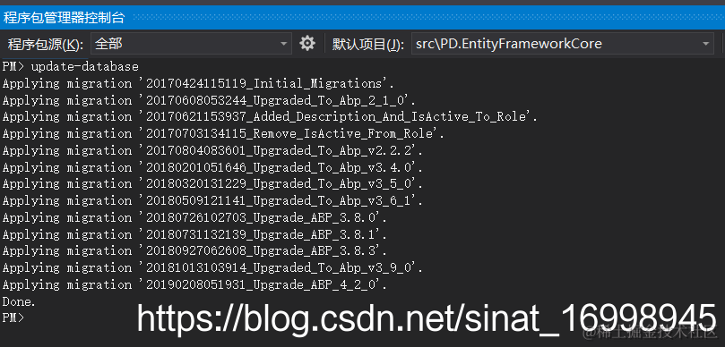 (5)输入命令更新数据库“update-database”,更新完成后,可通过查看