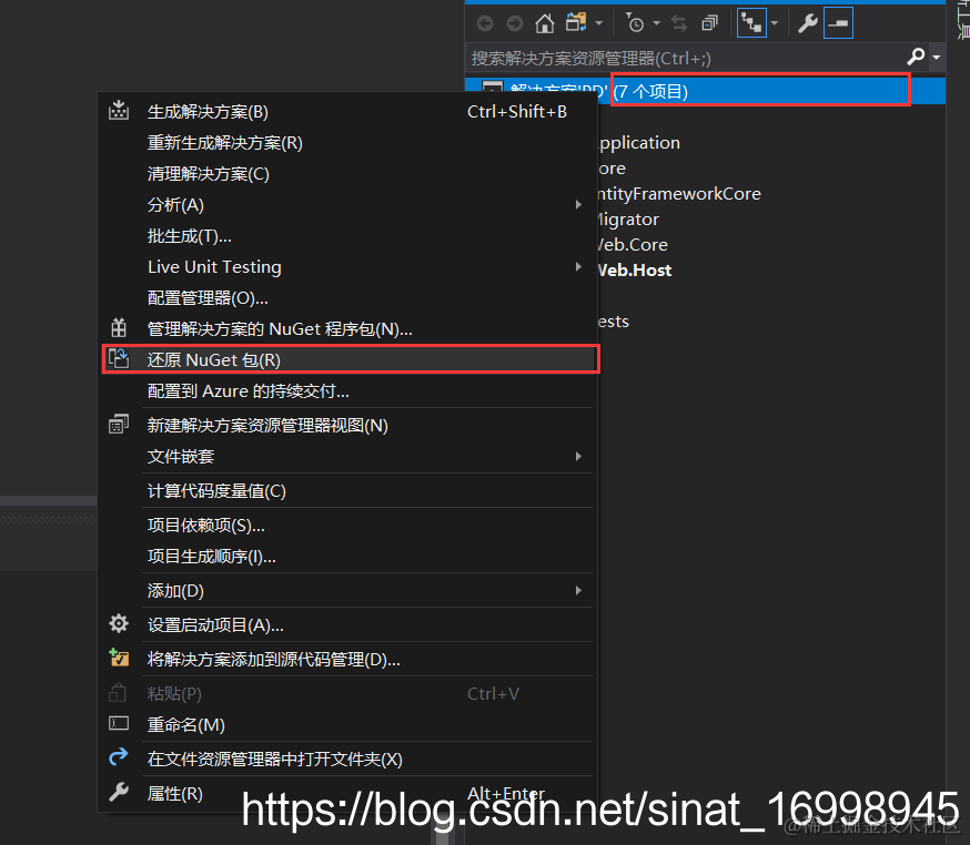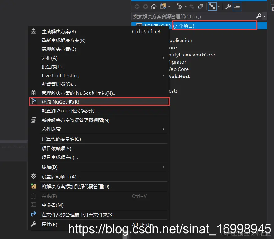 (2)右键点击“解决方案”,选择“还原NuGet包”,此时会进行拉去项目所需要的引用包。