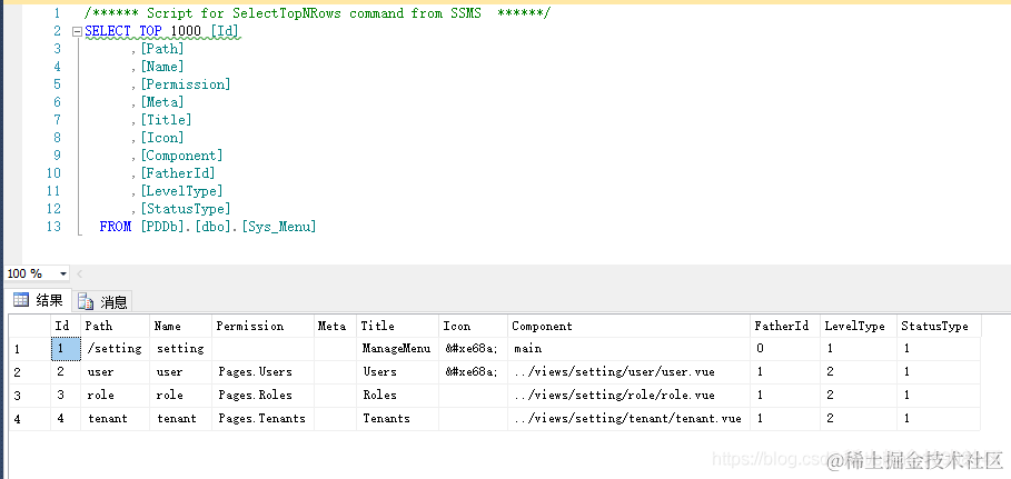 INSERT [dbo].[Sys_Menu] ([Id], [Path], [Name], [Permission], [Meta], [Title], [Icon], [Component], [FatherId], [LevelType], [StatusType]) VALUES (1, N'/setting', N'setting', N'', N'', N'ManageMenu', N'', N'main', 0, 1, 1)