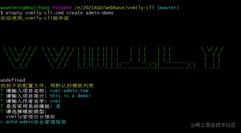 当在git bash中,上下键不能选择,可使用: `winpty vvmily-cli.cmd create admin-demo`
