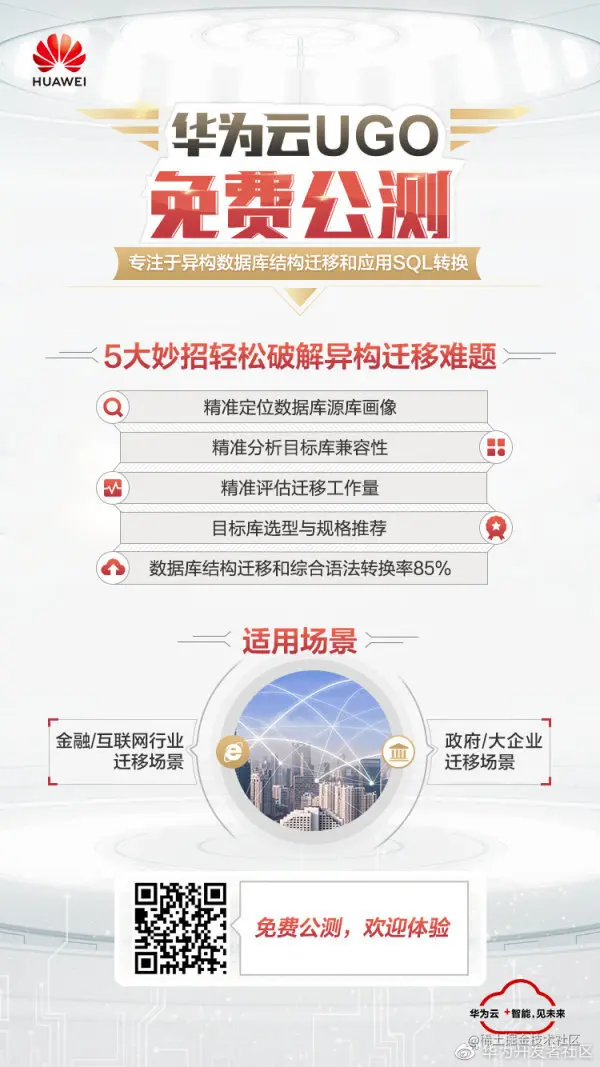应用实践方面,华为云 UGO 广泛适用于金融、互联网、政府等领域迁移改造场景,并在华为公司流程 IT 项目中获得优秀实践。华为公司流程 IT 拥有数十万张表,存储过程代码超过亿级,迁移数据量高达数 TB。华为云 UGO 通过迁移评估和 SQL 转换,助力华为公司流程 IT 迁移周期从以天为单位缩短为小时级,减少了 50%存储过程改造成本,节省了 70%+工作量,高效支撑华为公司流程 IT 数字化转型。
