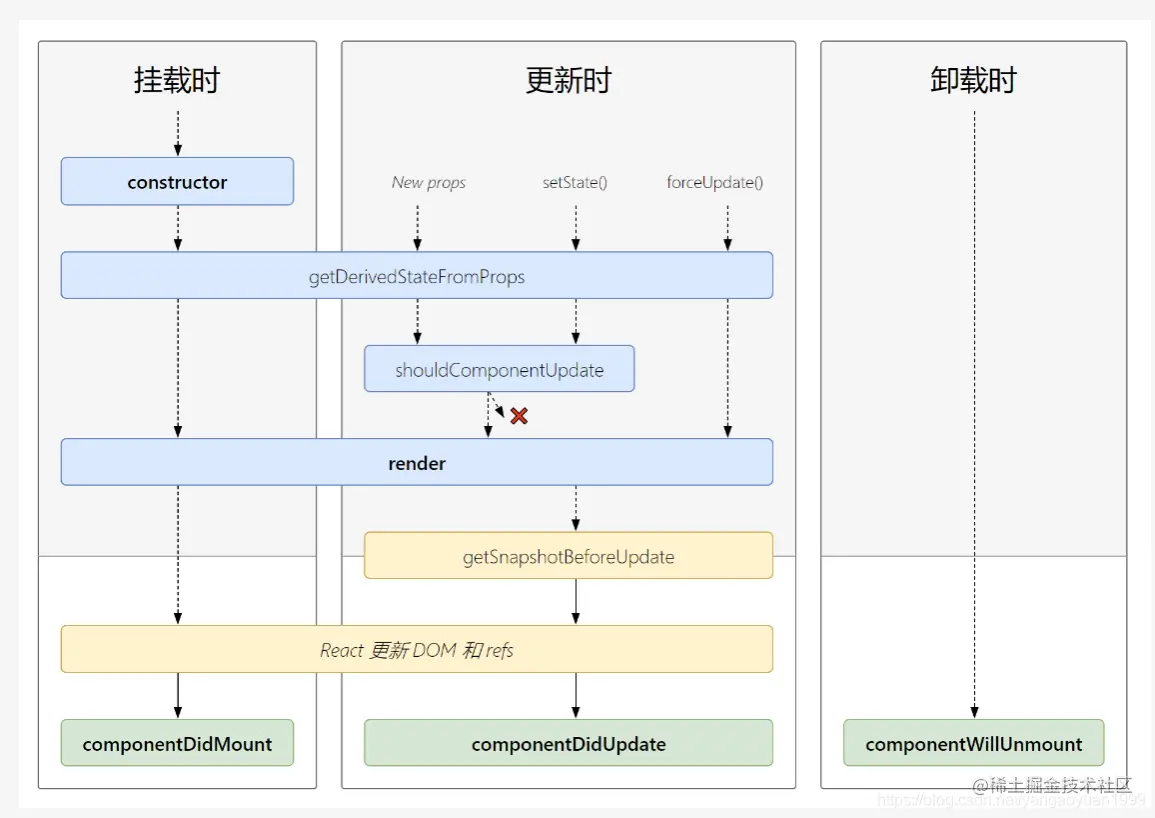 更新阶段:由组件内部this.setState()或父组件重新触发render()