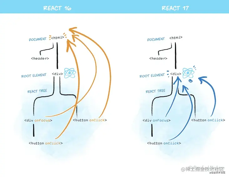 在React 17中,React将不再在后台的文档级别附加事件处理程序。取而代之的是,它将它们附加到渲染您的React树的根DOM容器: