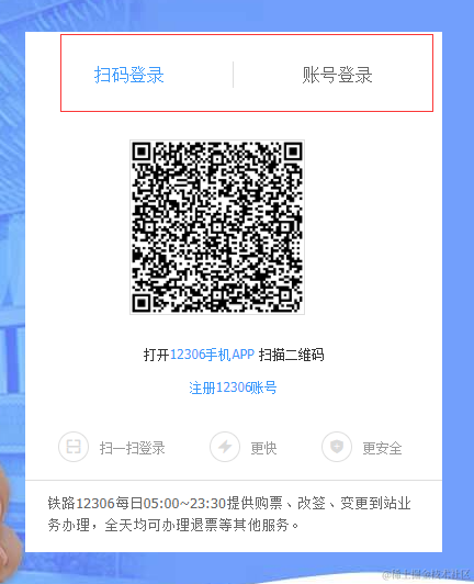 用 https://kyfw.12306.cn/otn/resources/login.html 做为起始登录页。网页的默认登录就是扫码,我们需要账号登录网站。这里用 selenium 模拟点击账号登录按钮。