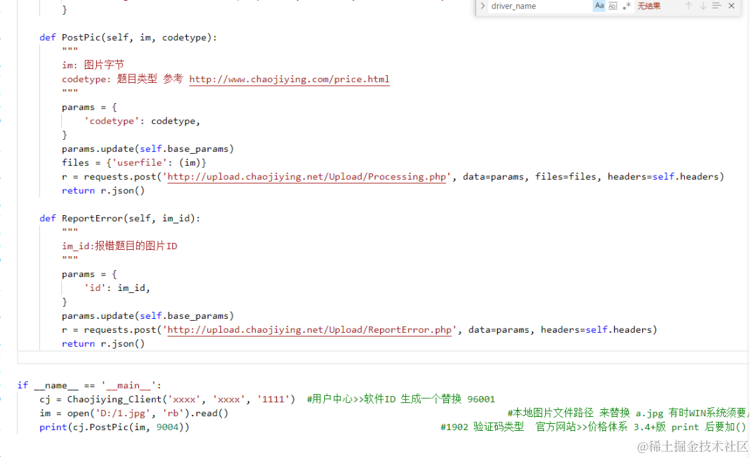 下面就是超级鹰的 Python 示例代码,把它改造成为 chaojiying 类。\