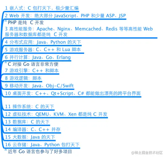 C语言的应用极其广泛,从网站后台,到底层操作系统,从多媒体应用到大型网络游戏,均可使用C语言来开发: