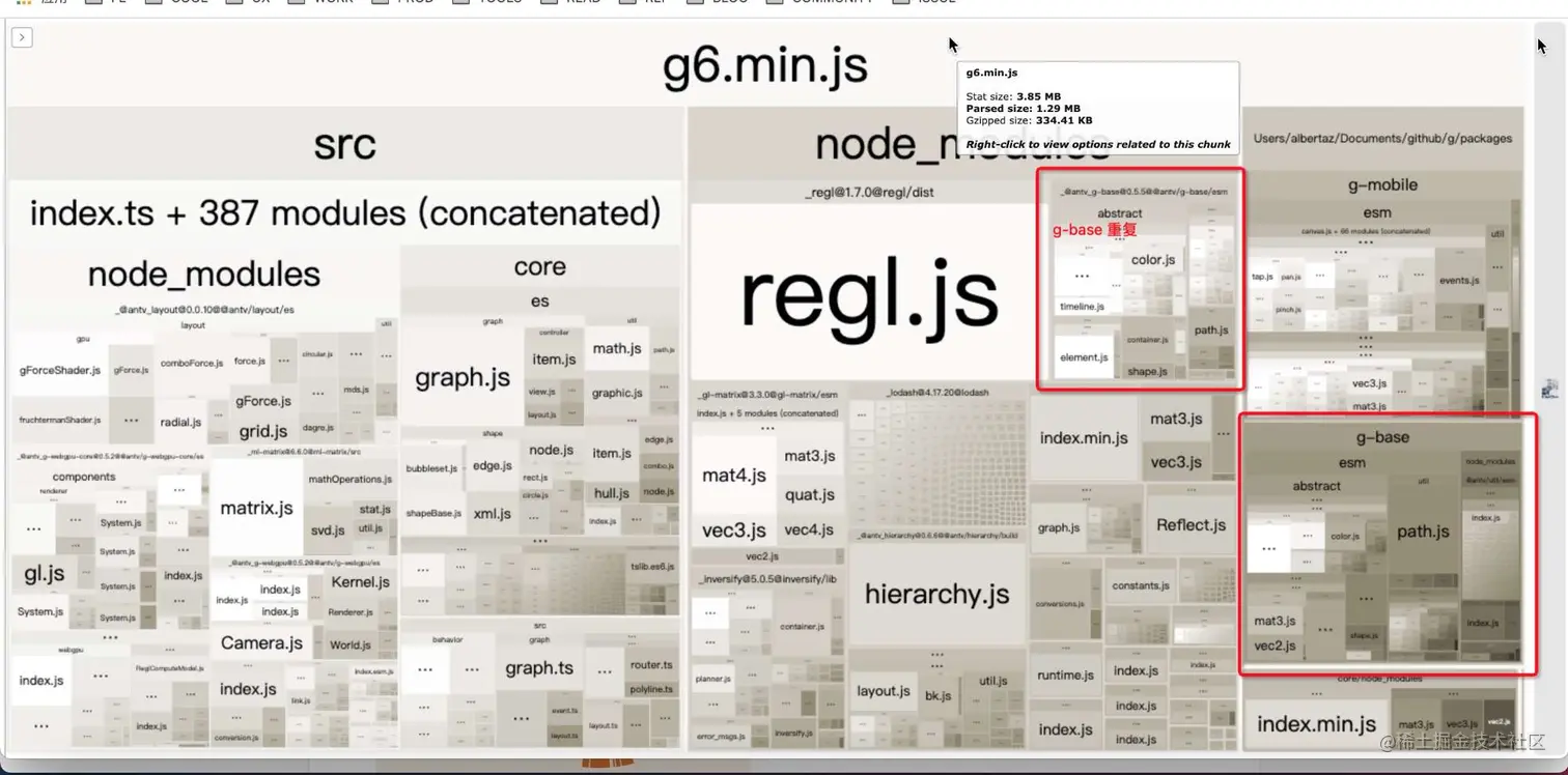 - 480k node_modules, 包括重复的 g-base 80k,regl 100k,重复的 gl-matrix、inversify 和 hierarchy 等。