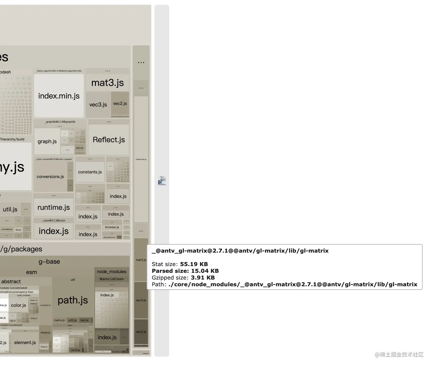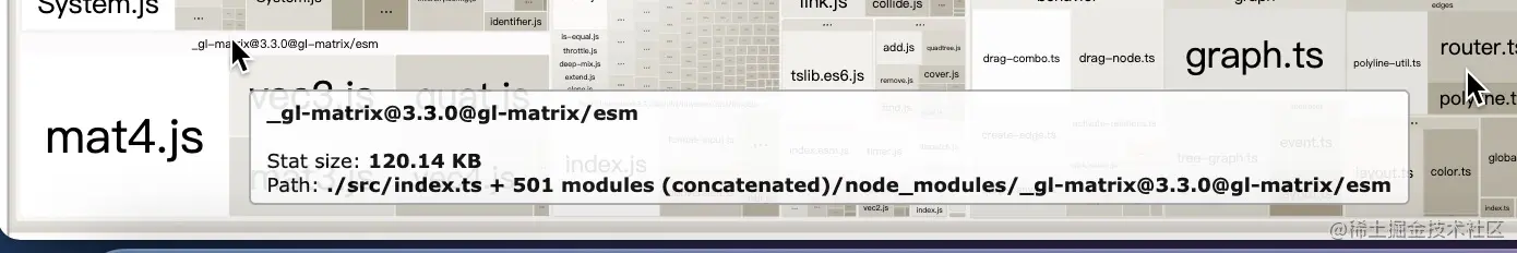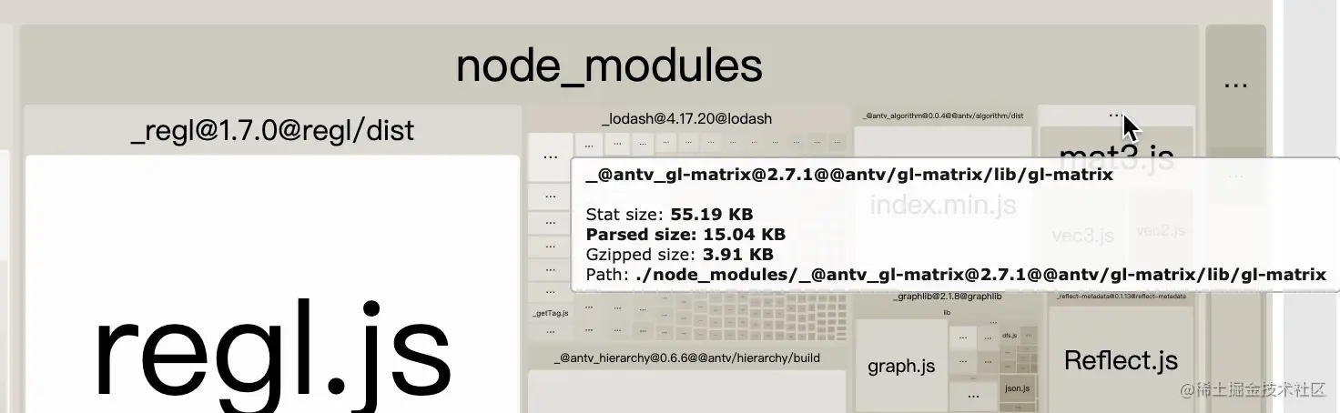 - 另外有重复的 gl-matrix,子包中 gl-matrix 跟 主包中的版本不一致,看起来也可以优化,大概有 60k 的 优化空间。