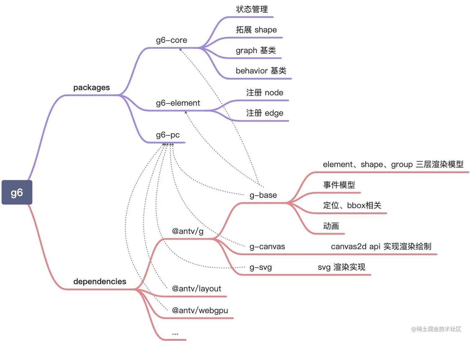 尽管这架构图看起来还算清晰,但每一块的实现分散在 g6 相关的多个包里,所以最后需要梳理一下 g6、 g 各个包之间的关系:
