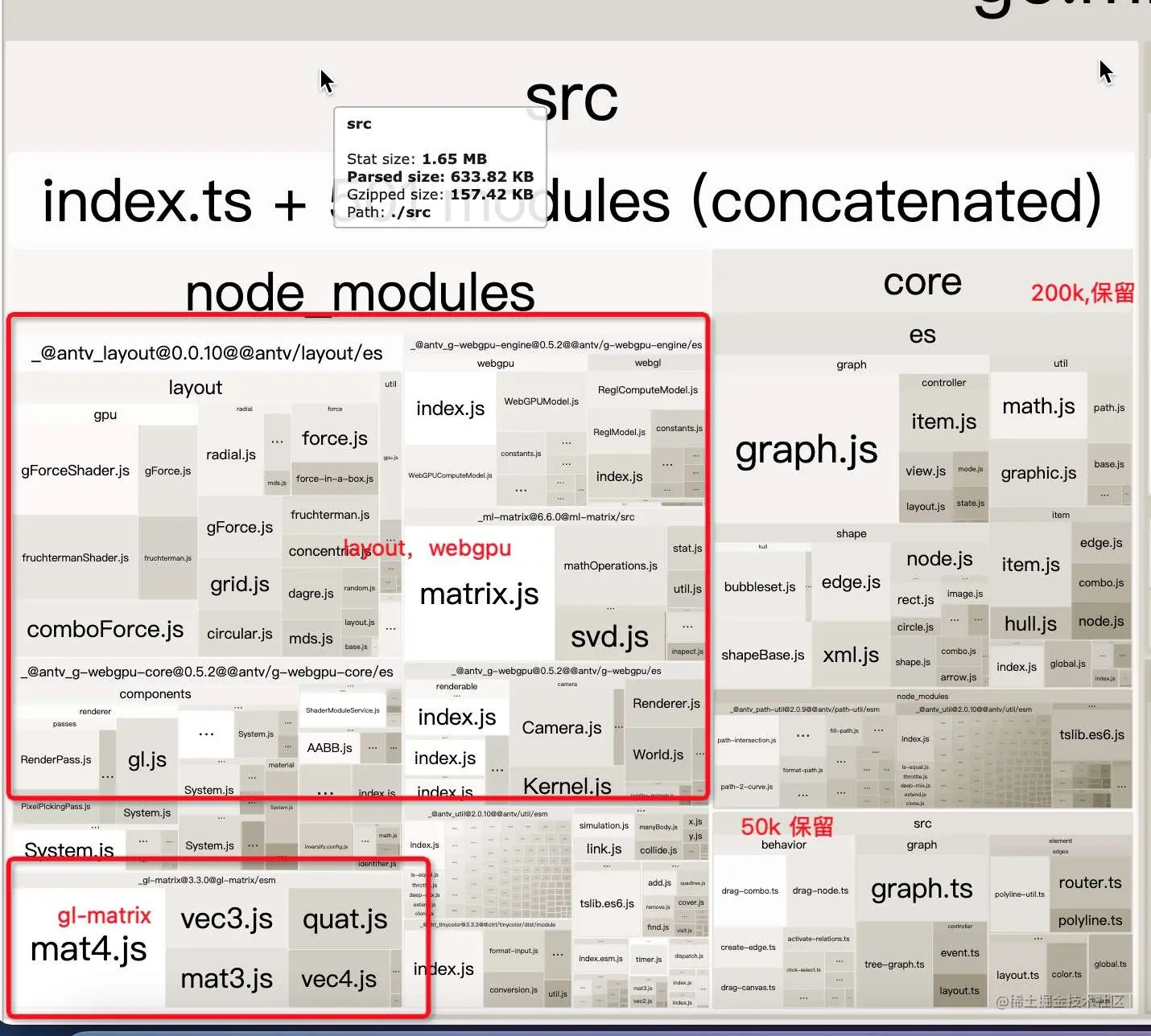 - 100k 的 regl,是 webgl 需要的包,移动端不需要。溯源查了下,发现只有 @antv/g-webgpu 中引了 regl,这在 layout 和 webgpu 优化完之后,空间也可以释放掉。