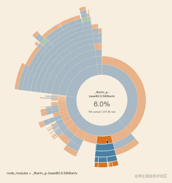 到此,我们看似完成了 g6-mobile 的开发,但打包构建出来之后我们发现了新的问题,g6-mobile 初始版本打包之后发现体积很大,parse 之后 1.3 M,gzip 之后 330k,这个尺寸移动端难以接受。具体打包状况如下: