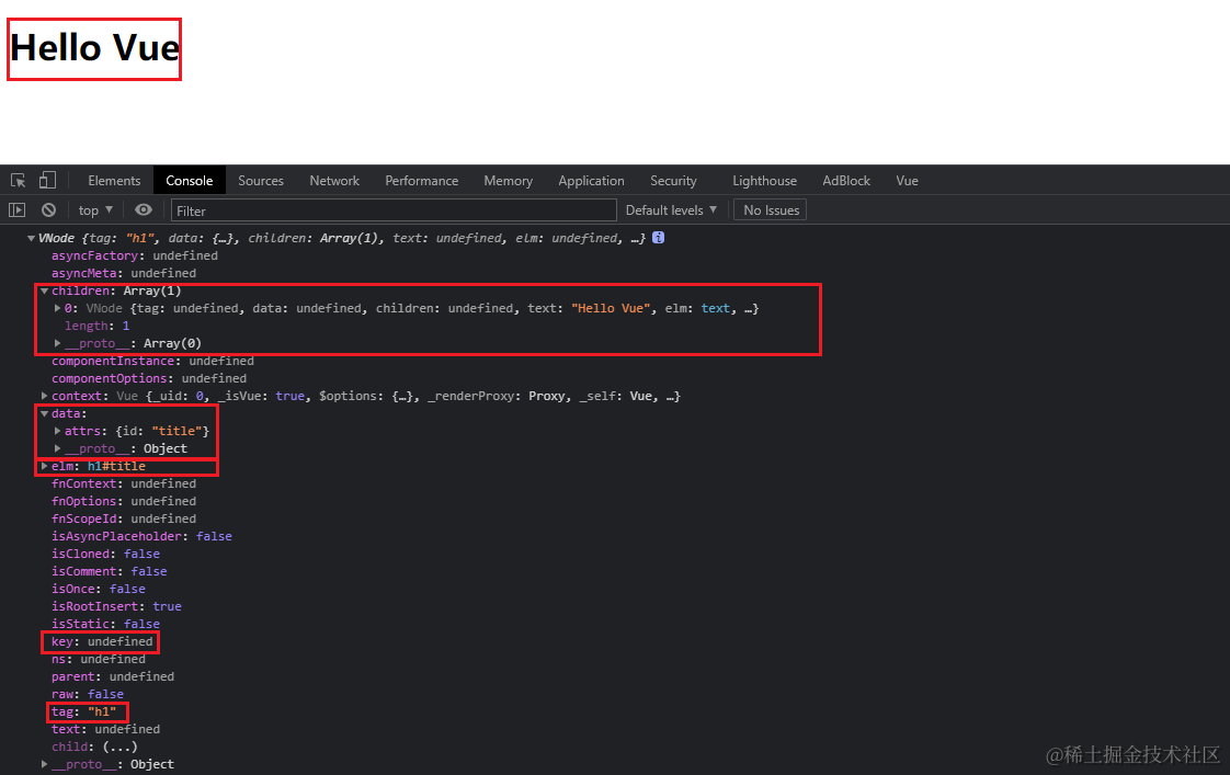 const vm = new Vue({ el: '#app', render(h) { // h(tag, data, children) // render h('h1', this.msg) // render h('h1', {domProps: {innerHTML: this.msg}}) // render h('h1', { attrs: { id: 'title' } }, this.msg) const vnode = h( 'h1', { attrs: { id: 'title' } }, this.msg ) console.log(vnode) return vnode }, data: { msg: 'Hello Vue' } }) -