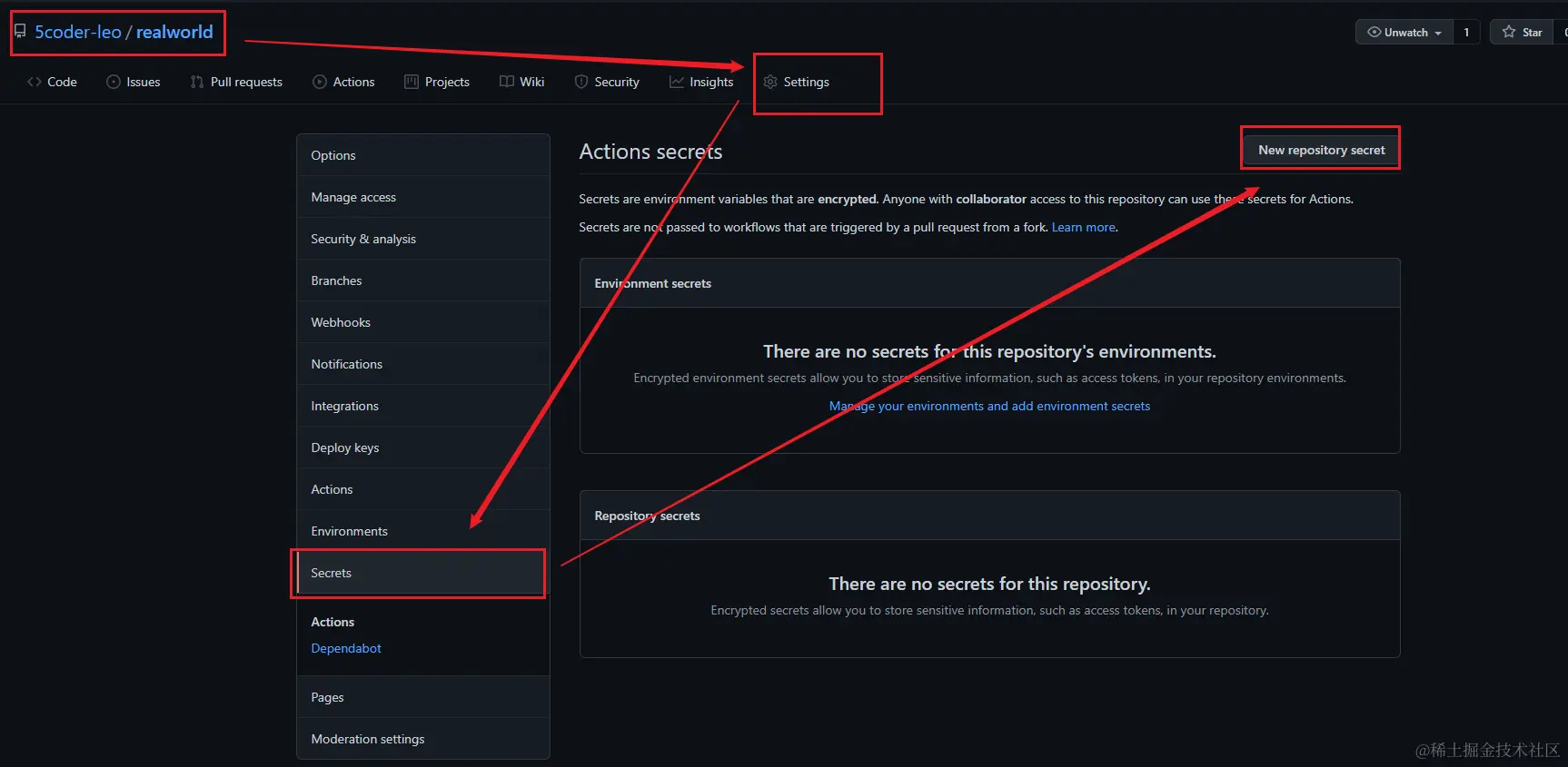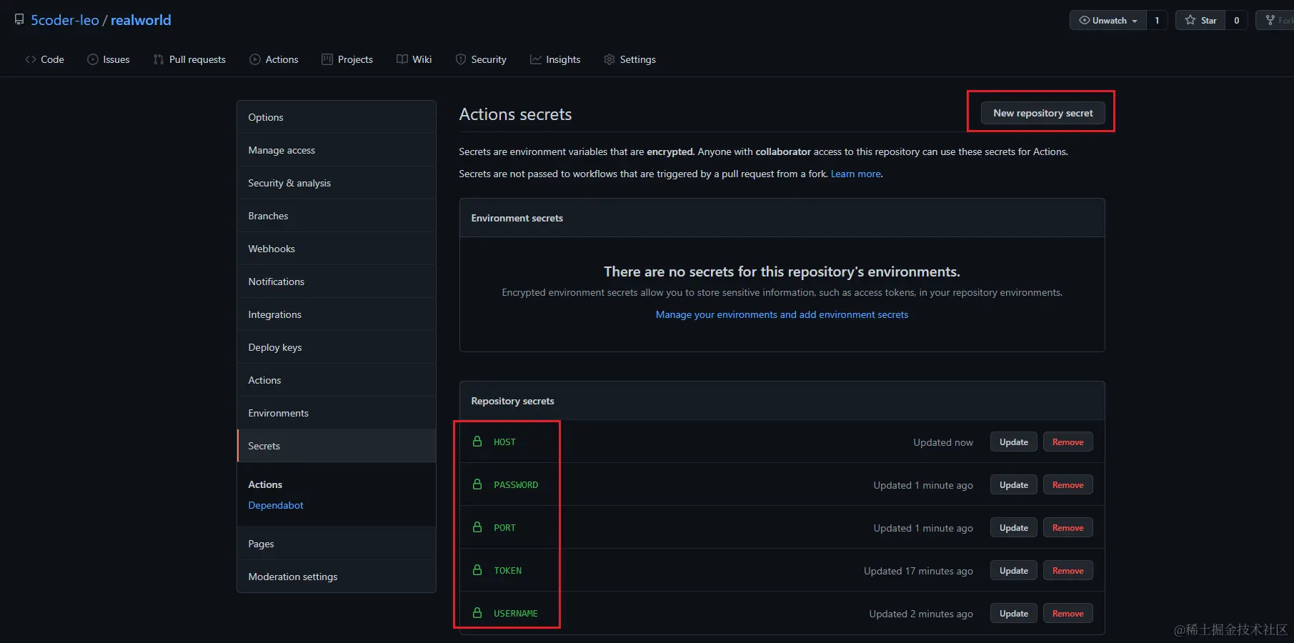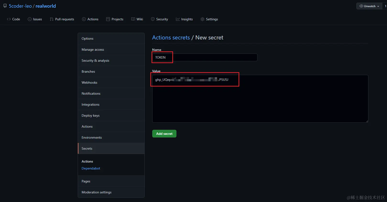 配置到项目的Secrets中:github.com/5coder-leo/…