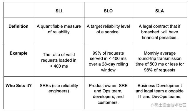 这三个术语之间的区别很简单。SLI 是用于定义和衡量 SLO 的指标。SLA 并不适用于每个业务,但是当有 SLA 时,它作为 SLO 的上限。