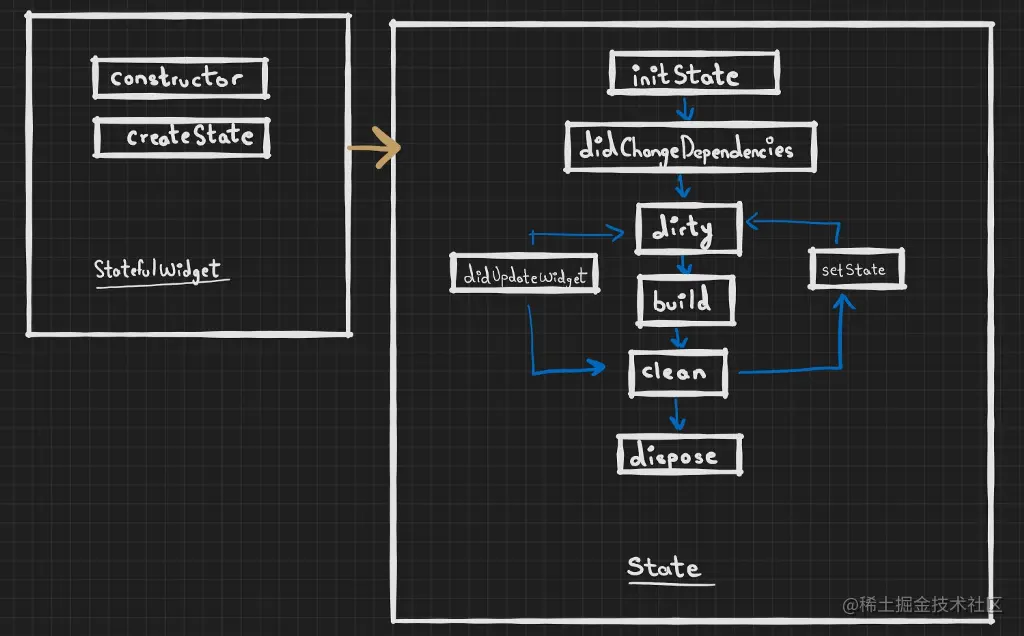 每个有状态的widget都有一个相应的有状态元素。Flutter框架调用createElement方法来创建有状态元素,有状态元素被安装到元素树中。由于这是一个有状态的