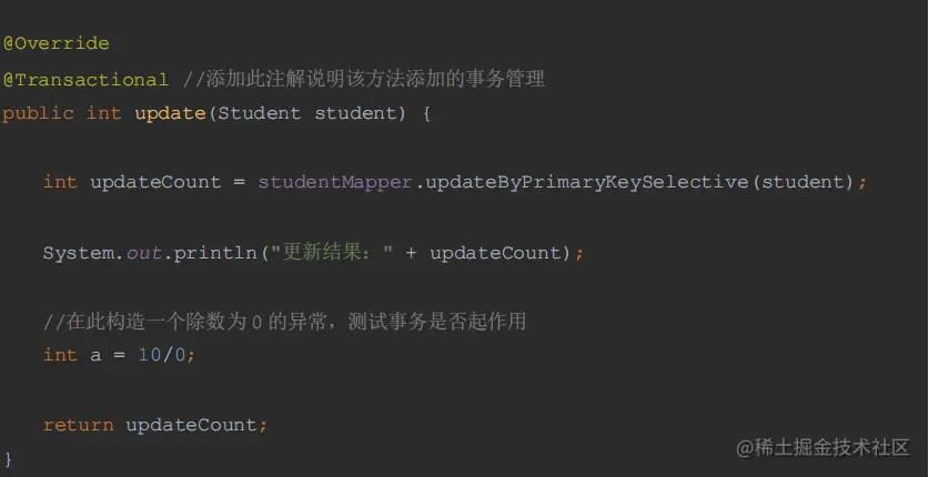 (11) 在 StudentServiceImpl 接口实现类中对更新学生方法进行实现,并构建一个异常,同时在该方法上加@Transactional 注解