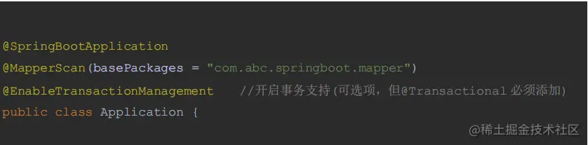 ➢ 在入口类中使用注解 @EnableTransactionManagement 开启事务支持