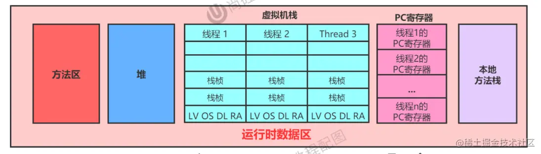 - 其中有一些会随着虚拟机启动而创建,随着虚拟机退出而销毁,红色区域部分